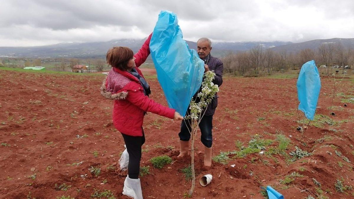 Babasına yardım eden Fatma Esin Tuna’da evinden getirdiği battaniyeyi bir fidanın üzerine örterek, “Sabah uyandığımızda her yer kardı. Eridi ama dağlarda kar var. Bahçemize geldik ağaçlar hep çiçek açtığı için önlem almak istedik. Bebek bunlar, kızımın küçükken kullandığı battaniyesini getirdim bu bebeklerin üzerine örttüm. İnşallah bize yazın bol bol meyve verecekler” diye konuştu.
